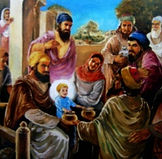 On seeing the child, the Faqir respectfully made a deep bow after which he offered two earthen pots containing sweetmeats. The Pir had purchased one pot from a Muslim and the second pot of sweets from a Hindu. After placing both the pots containing sweets before Gobind Rai, the Pir sat down with folded hands and looking at the child, Gobind Rai placed his left hand on one of the pots and at the same time placed his right hand on the other pot. The child then smiled and looked at the pir who made a long and deeper bow to the holy child.